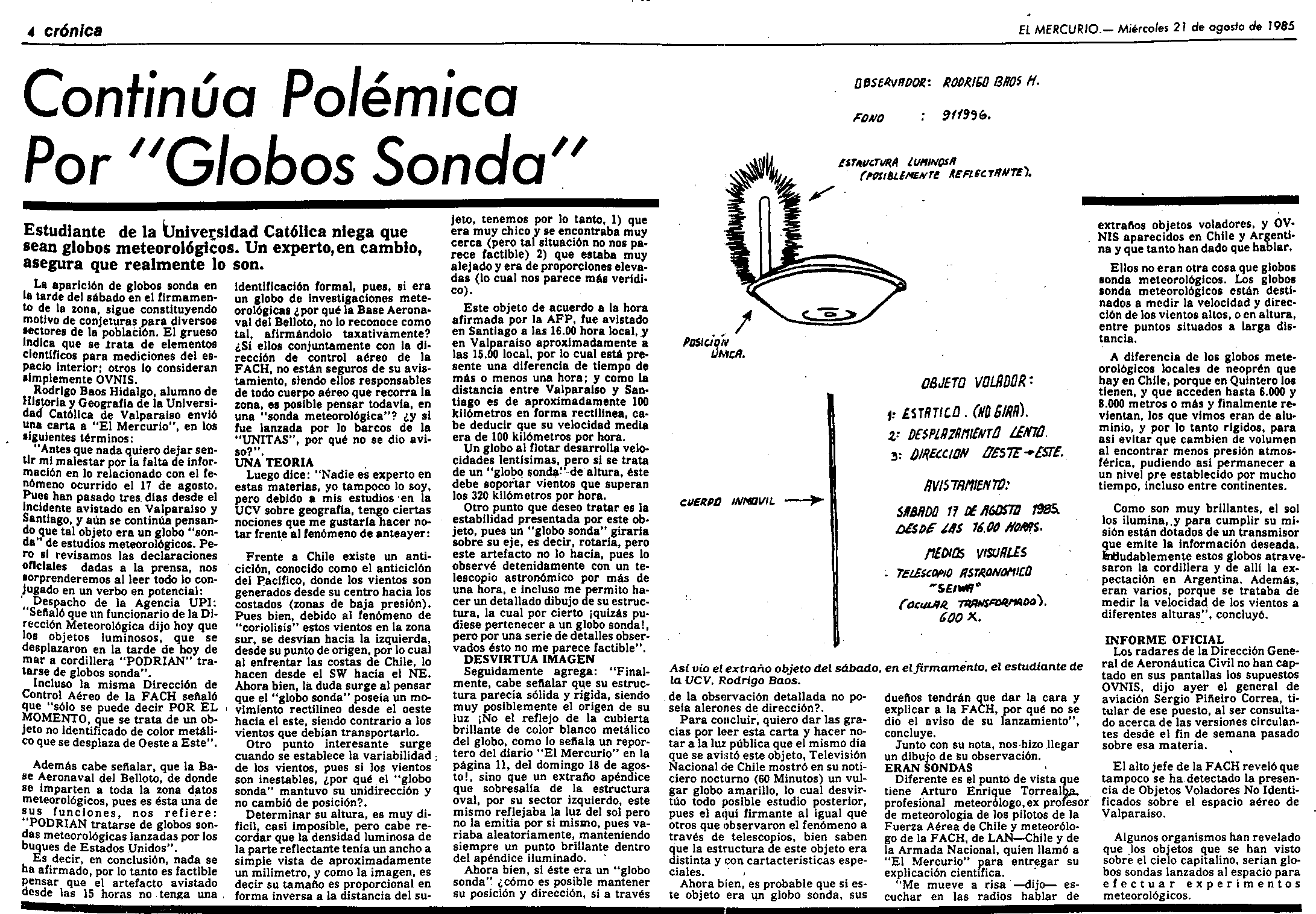texto señalado más arriba dice: "Antes que nada quiero dejar sentir mi malestar por la falta de información en lo relacionado con el fenómeno ocurrido el 17 de agosto. Pues han pasado tres días desde el incidente avistado en Valparaíso y Santiago, y aún se continúa pensando que tal objeto era un globo "sonda" de estudios meteorológicos. Pero si revisamos las declaraciones oficiales dadas a la prensa, nos sorprenderemos al leer todo lo conjugado en un verbo en potencial: Despacho de la Agencia UPI: "Señaló que un funcionario de la Dirección Meteorológica dijo hoy que los objetos luminosos, que se desplazaron en la tarde de hoy de mar a cordillera "PODRIAN" tratarse de globos sonda". Incluso la misma Dirección de Control Aéreo de la FACH señaló que "sólo se puede decir POR EL MOMENTO, que se trata de un objeto no identificado de color metálico que se desplaza de Oeste a Este". Además cabe señalar, que la base aeronaval de El Belloto, de donde se imparten a toda la zona datos meteorológicos, pues es ésta una de sus funciones, nos refiere: "PODRIAN tratarse de globos sondas meteorológicas lanzadas por los buques de Estados Unidos". Es decir, en conclusión, nada se ha afirmado, por lo tanto es factible pensar que el artefacto avistado desde las 15 horas no tenga una identificación formal, pues, si era un globo de investigaciones meteorológicas ¿por qué la Base Aeronaval de El Belloto, no lo reconoce como tal, afirmándolo taxativamente? ¿Si ellos conjuntamente con la dirección de control aéreo de la FACH, no están seguros de su avistamiento, siendo ellos responsables de todo cuerpo aéreo que recorra la zona, es posible pensar todavía en una "sonda meteorológica"? ¿y si fue lanzada por los barcos de la "UNITAS", por qué no se dio aviso?".